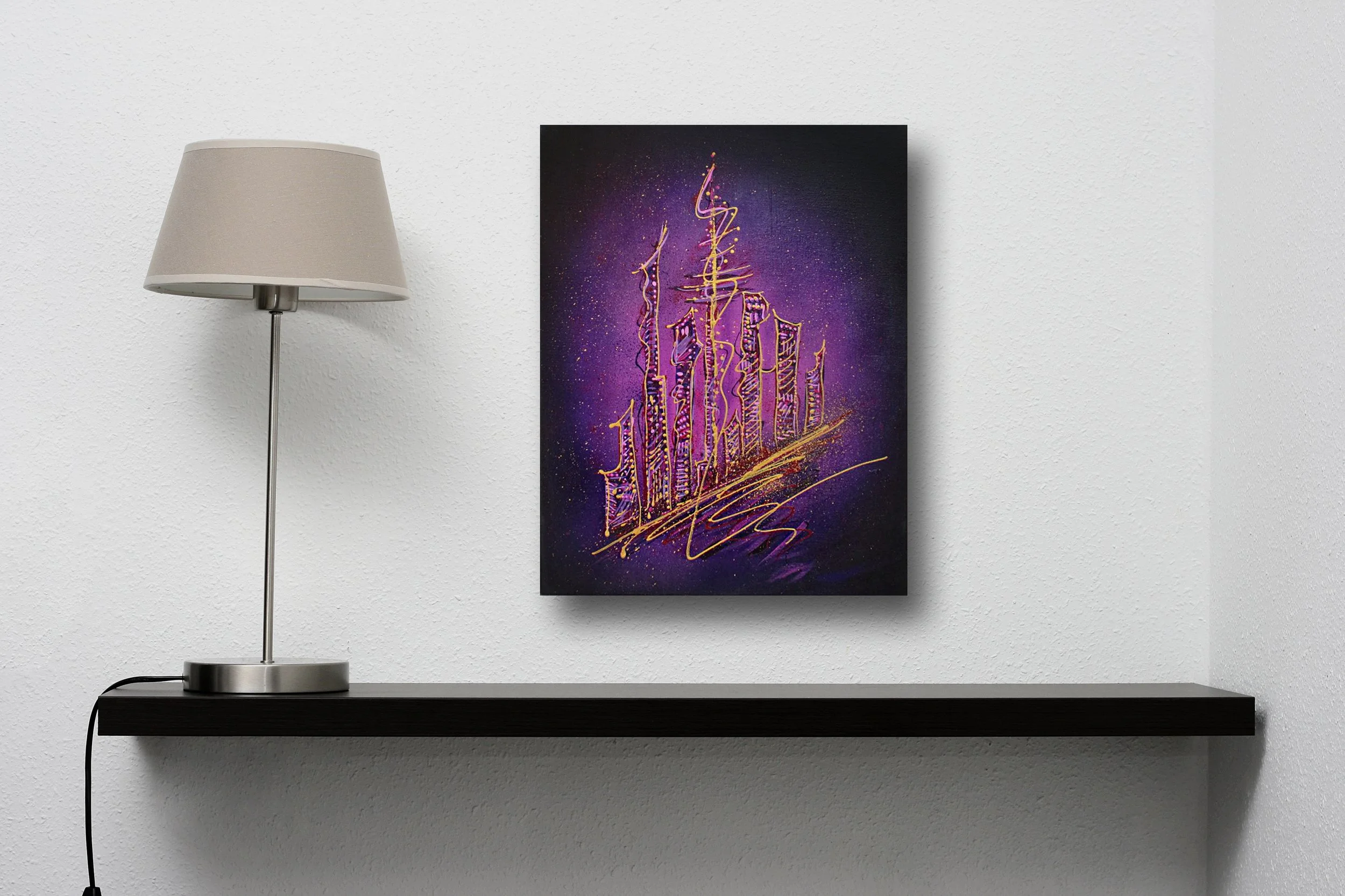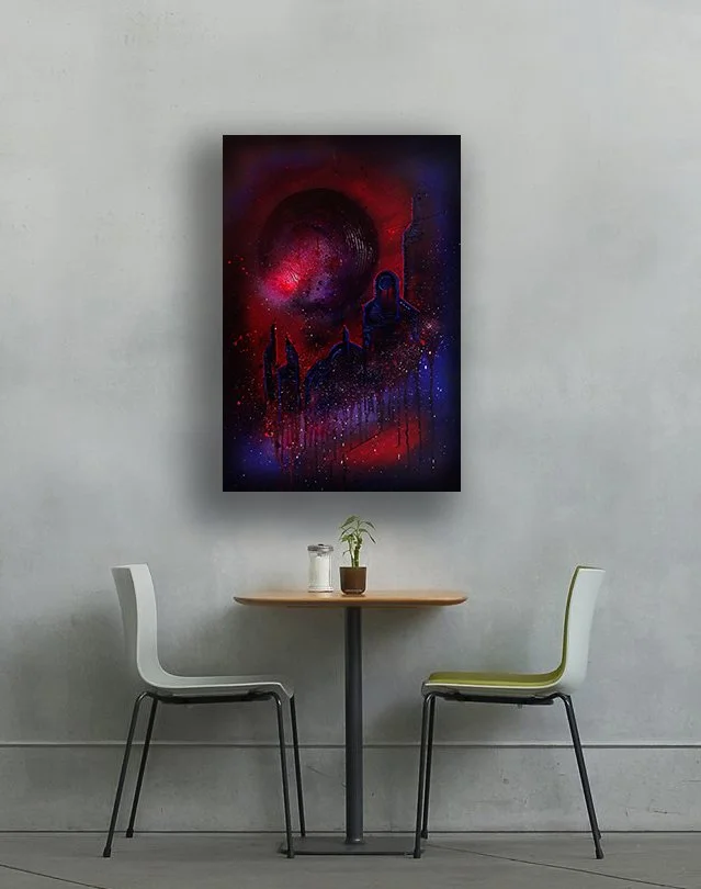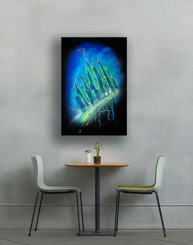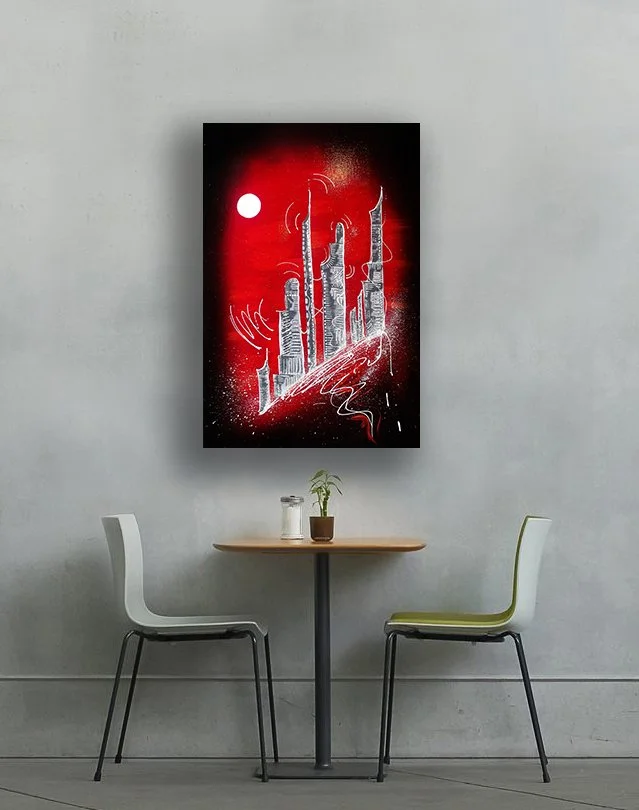 La collection industrielle repose principalement sur des expérimentations avec la peinture en aérosol et l’étude de la résistance colorielle des pigments sur des fonds sombres. Les œuvres sont réalisées sur toile avec de l’acrylique fluide, permettant de créer des lignes organiques et des effets de ‘‘splash’’ dynamiques